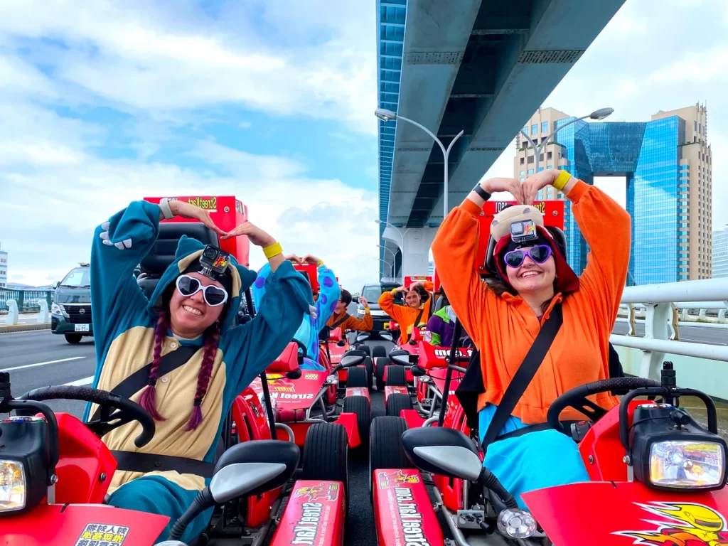 Des imperméables sont fournis, donc pas trop de souci à se faire côté humidité. Le plaisir de fendre l’air reste intact sous la pluie, et les éclaboussures ajoutent même une bonne dose de sensations d’aventure. Ce que nos amis étrangers nous disent souvent : « Rainy kart was even better than expected! » Les photos que l’on ne peut capturer que sous la pluie récoltent des réactions incomparables sur les réseaux sociaux. Un convoi de karts en costumes se reflétant sur la route mouillée, voilà un cliché impossible à obtenir par beau temps. Concernant les costumes, différentes tenues sont proposées, mais aucun costume lié à Mario Kart n’est disponible. Street Kart n’a aucun lien avec Nintendo ni avec la série Mario Kart.